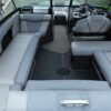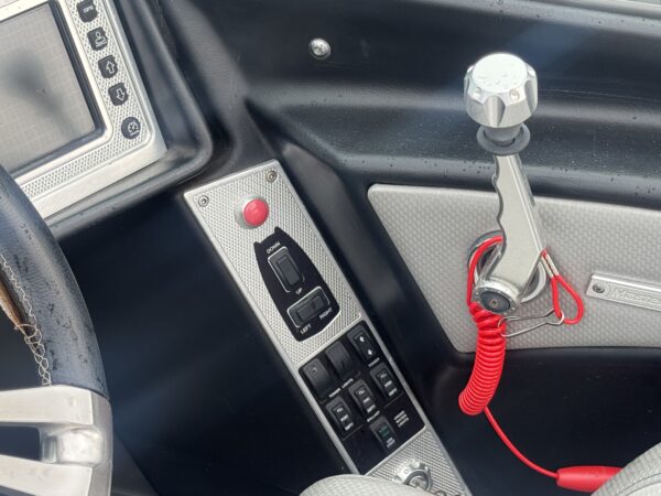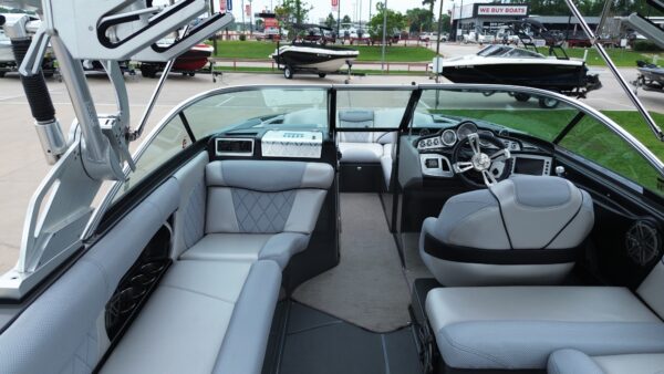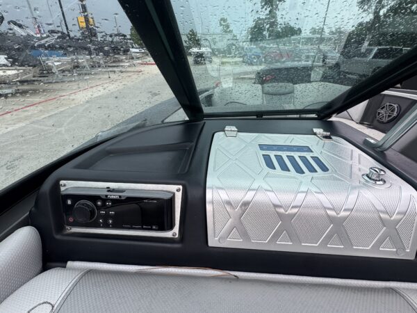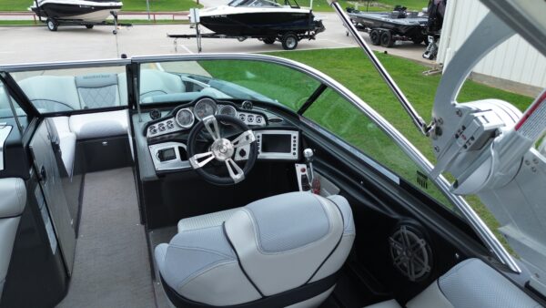Inside, you’ll find a spacious and upscale interior loaded with comfort and style. Plush wraparound seating, premium upholstery, and ample storage make it ideal for long days on the water. The helm is equipped with intuitive controls and a touchscreen display, putting everything you need right at your fingertips.