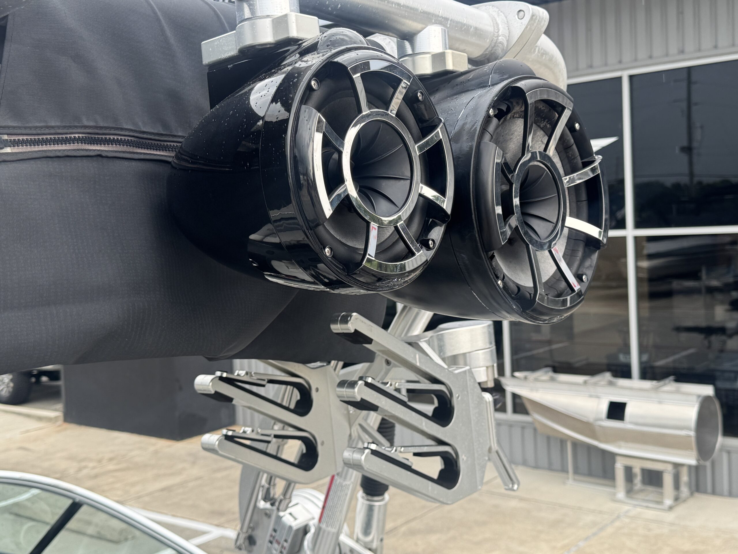 - Tower with bimini, board racks, and lights